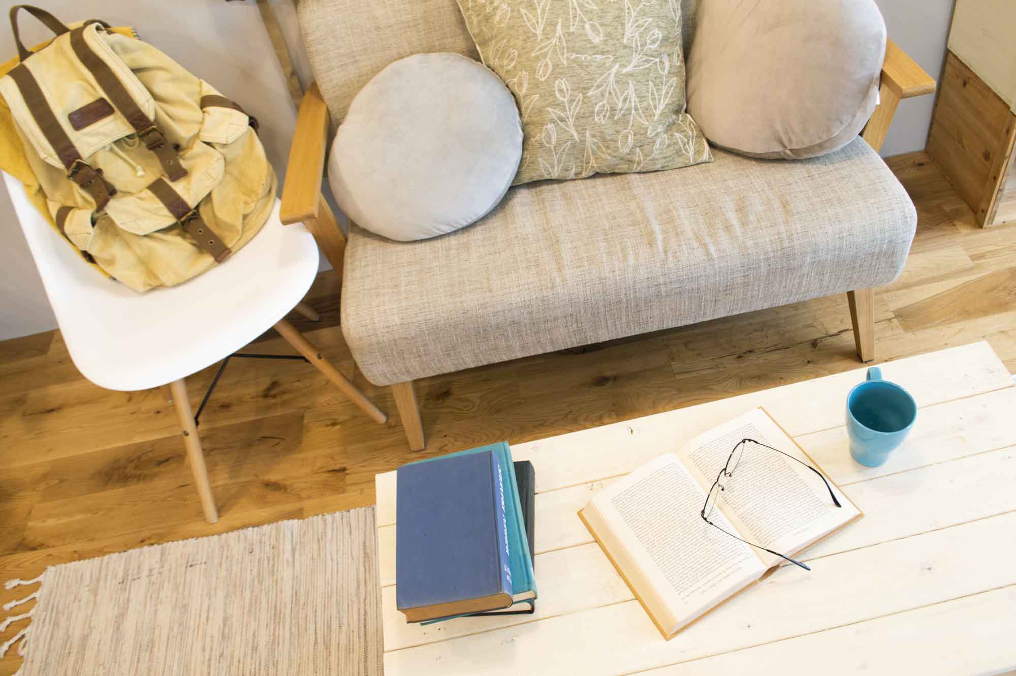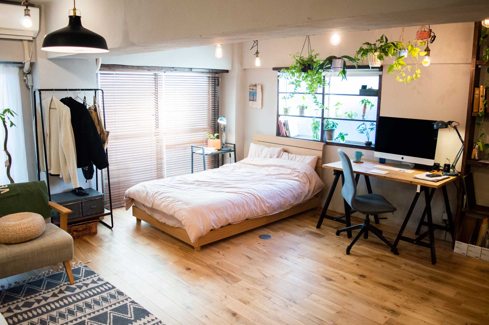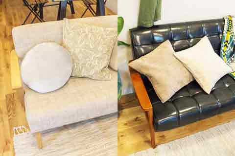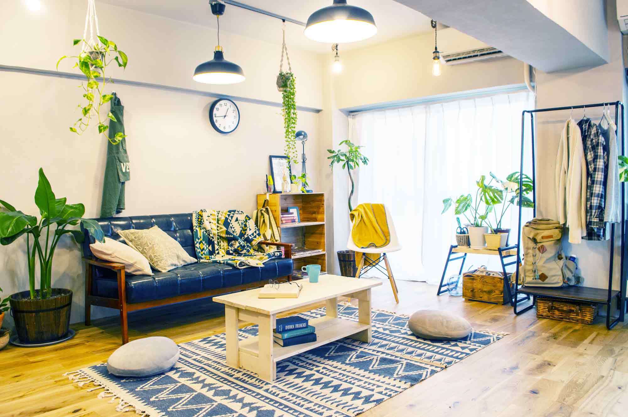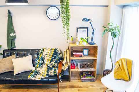 ブランケットやクッションなど小物が充実。一人暮らしのキャラクター設定に合わせて組み替えることでインテリアの雰囲気をガラリと変えることができます。