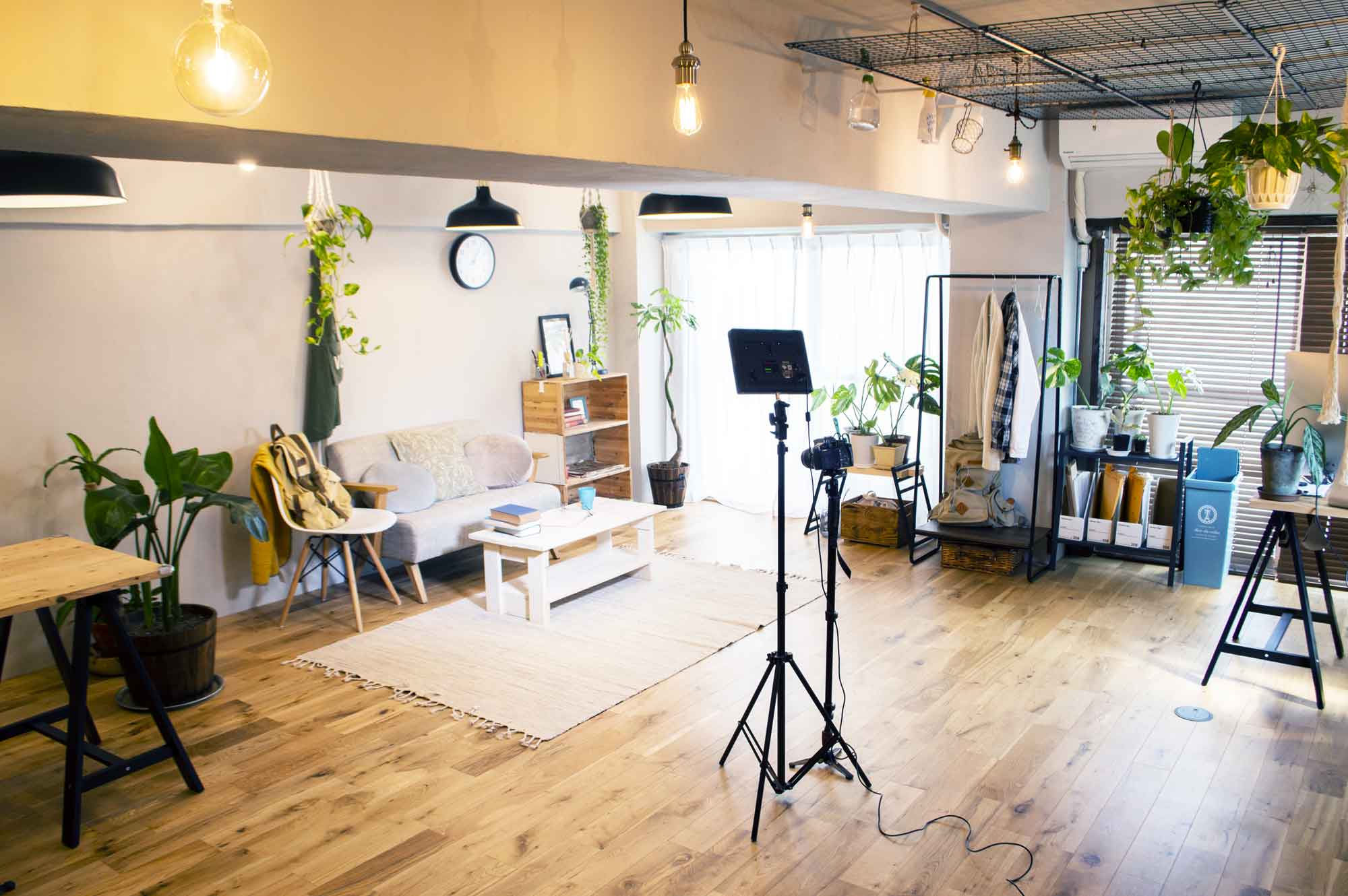 生命力あふれる植物と自然光が調和するスタジオ。専門的な管理による高品質な緑が、制作物に深みのあるリアルな彩りを与えます。