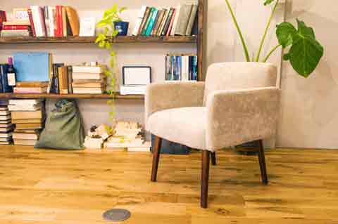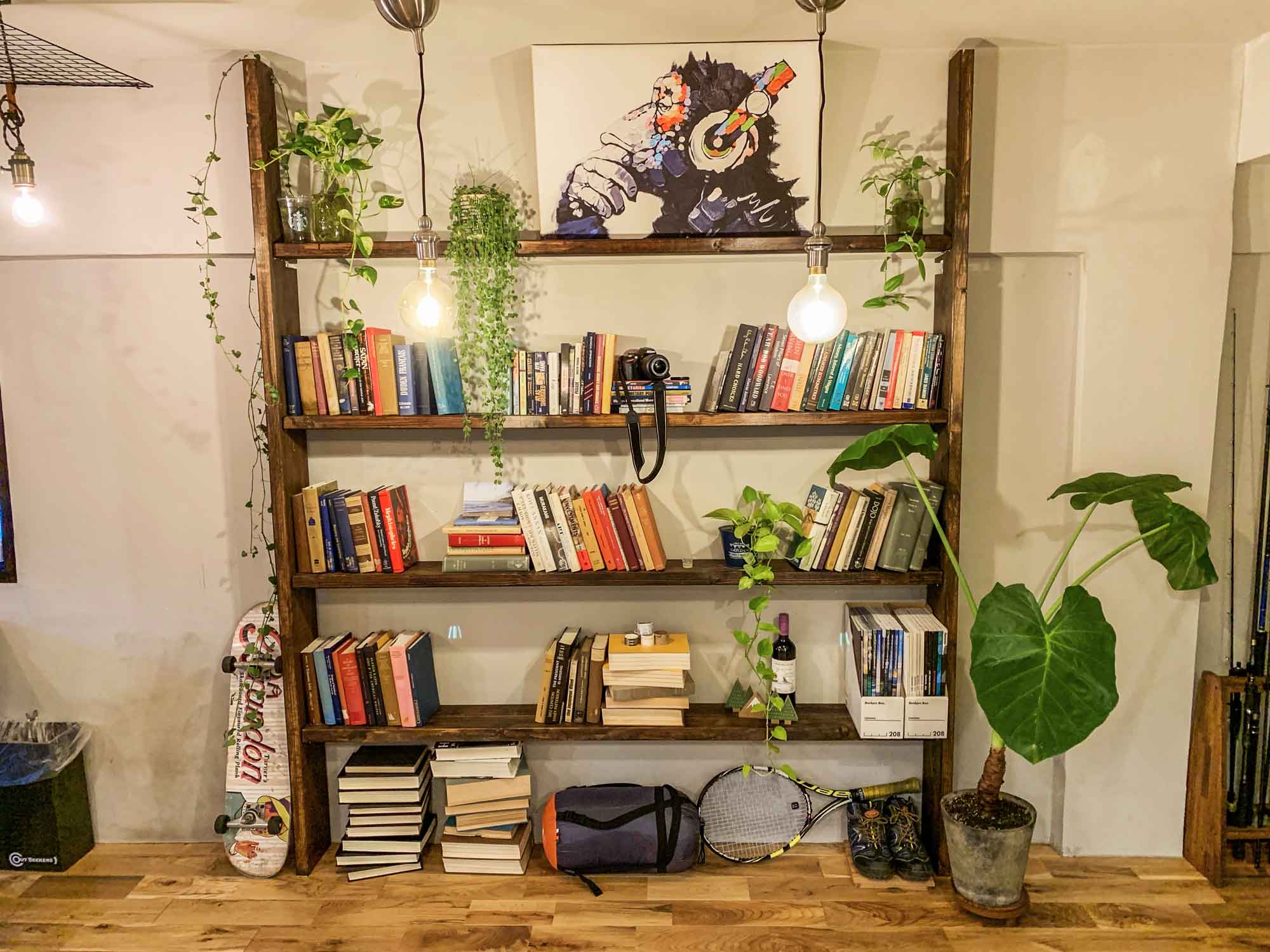 たくさんの洋書や写真立てを飾った壁面いっぱいの本棚があります。本ではなくお皿やコップを飾り、ダイニングテーブルを置くとダイニングキッチンに替わり、たくさんの用途に切り替えて使うことができます。