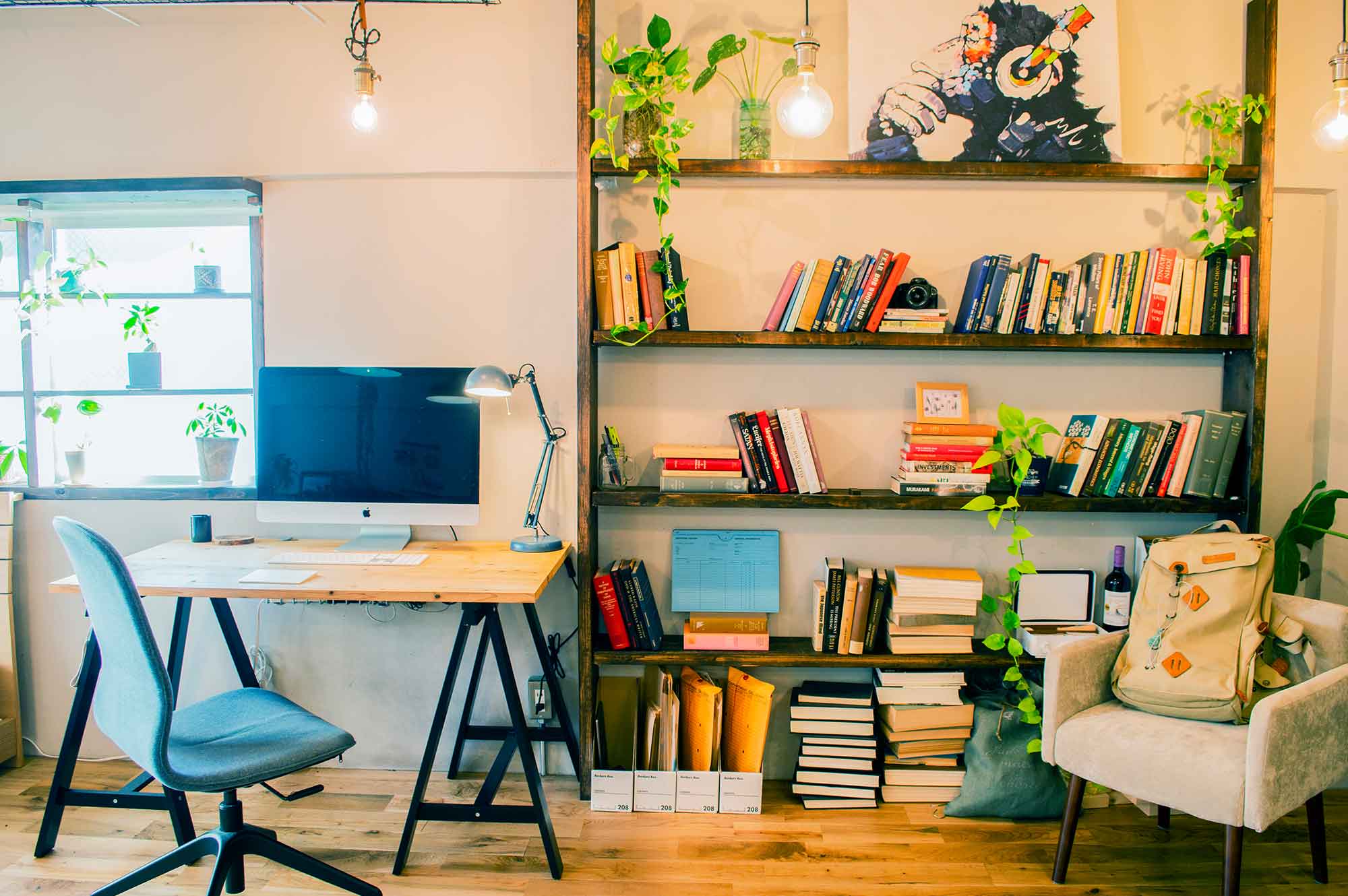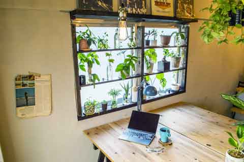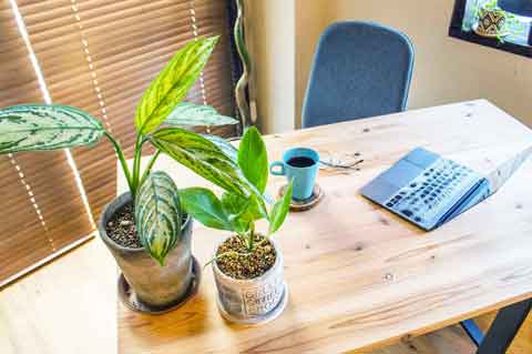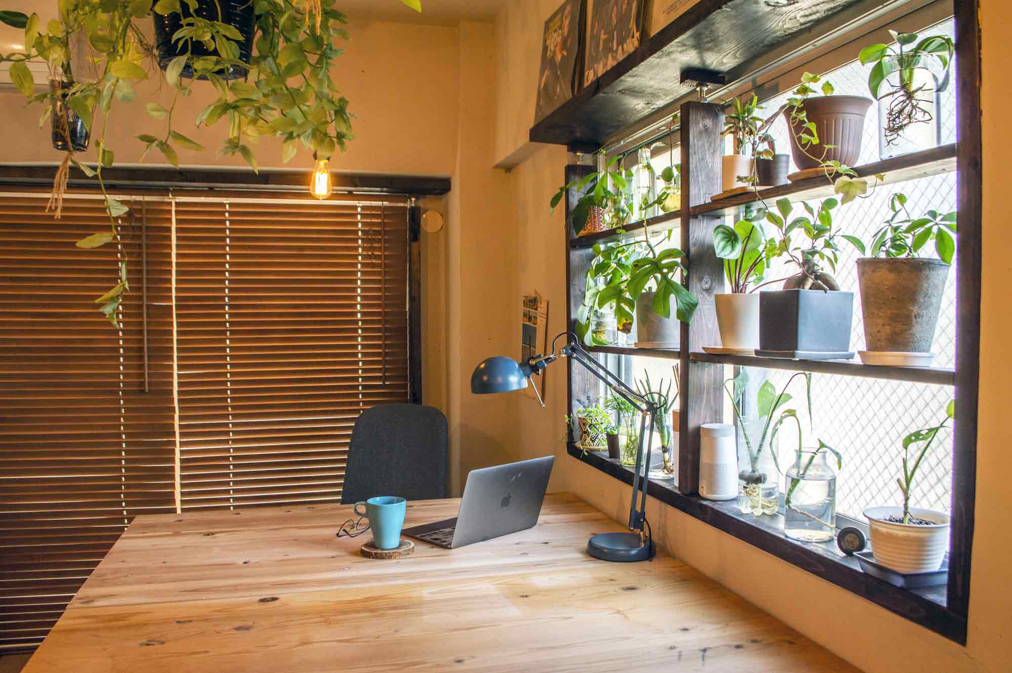 ウッドブラインドを背景にしたウッドデスクは、パソコン作業を行うリモートワーク環境の書斎として撮影できます。観葉植物を本に置き換えても味ある雰囲気になります。