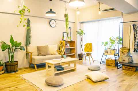 女性の部屋なら北欧・ナチュラルインテリアとして白とベージュを基調とした家具・小物を選択。可愛い落ち着いた雰囲気にできます。※401号室との併用利用(別料金)が必要です。